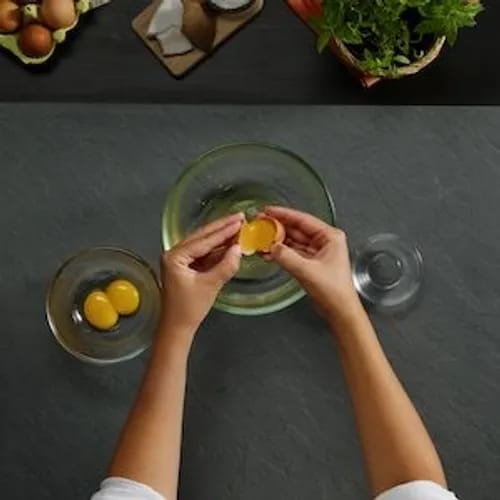 Wir beginnen damit, die Eier zu brechen und die Eigelbe sorgfältig von den Eiweißen zu trennen.
