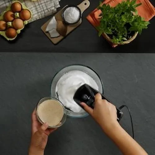 Nun nehmen wir das Eiweiß und beginnen, es mit Hilfe eines elektrischen Mixers steif zu schlagen. Wenn es beginnt, dichter zu werden, fügen wir den Zucker nach und nach hinzu. Wir schlagen weiter, bis der Zucker vollständig eingearbeitet ist.