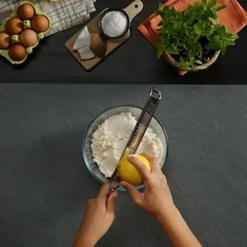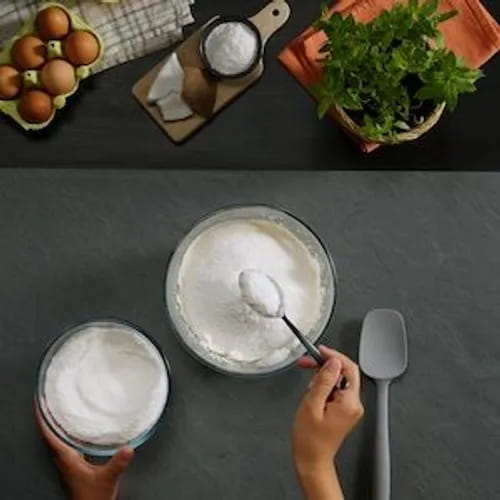 Wir legen den Mixer beiseite und beginnen, das Kokosmehl nach und nach mit einem Spatel einzuarbeiten. Wir mischen mit sanften Bewegungen von oben nach unten, um die Struktur des geschlagenen Eiweißes zu erhalten. Wir fügen auch die geriebene Zitronenschale hinzu.