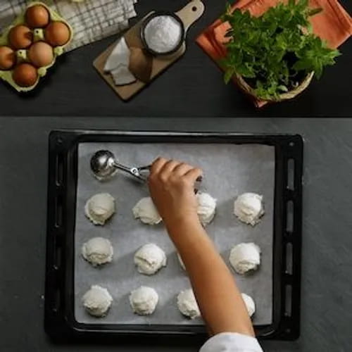 Sobald wir eine weiche Mischung haben, nehmen wir ein mit Backpapier ausgelegtes Backblech. Mit einem Löffel formen wir Kugeln und legen sie auf das Backblech, wobei wir einen gewissen Abstand zwischen ihnen lassen, da sie beim Backen leicht aufgehen werden. Wir backen die Kekse in einem auf 180°C vorgeheizten Ofen und backen sie etwa 8-10 Minuten. Wir servieren die Kekse in einer Holzschale und dekorieren sie für einen zusätzlichen Touch mit ein paar Minzblättern.