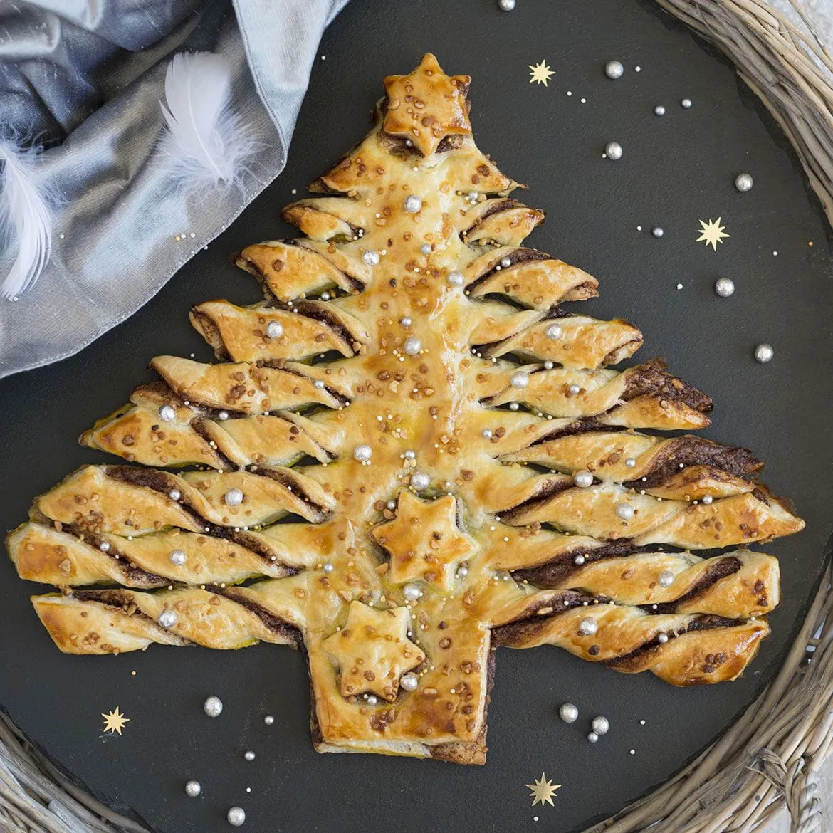 Slice the scamorza cheeses into thin slices and then use them to stuff the puff pastry strips together with the ham. Roll and slightly spread the pastry to mimic the shape of a rose. With the puff pastry roses, now compose a Christmas tree: place a rose at the top, followed by 2, then 3 and so on.