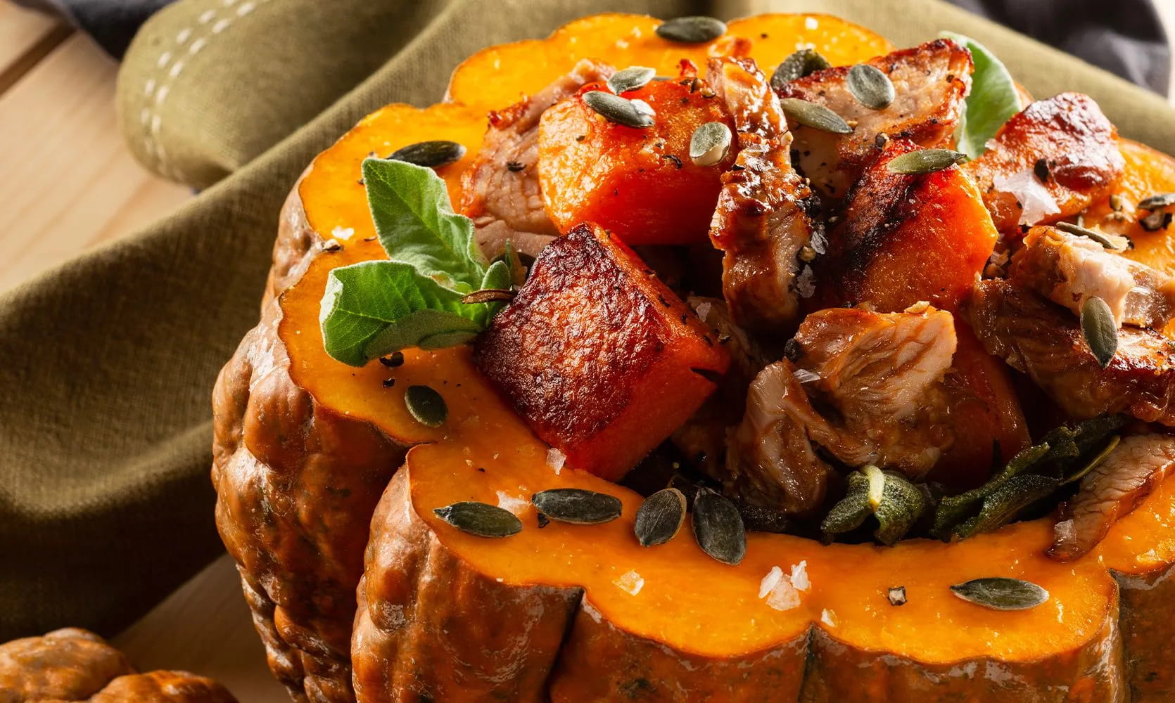 Add the AIA Turkey Roast, mix and serve inside the pumpkin decorating with some sage and rosemary leaves.