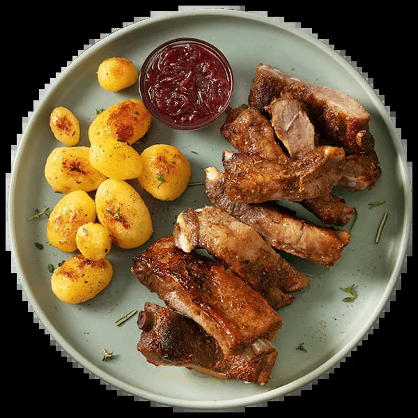 Deliziose costine di suino cotte arrosto. Pronte da scaldare e gustare in pochi minuti. Fornite nel conveniente formato "Famiglia" da 1 kg.