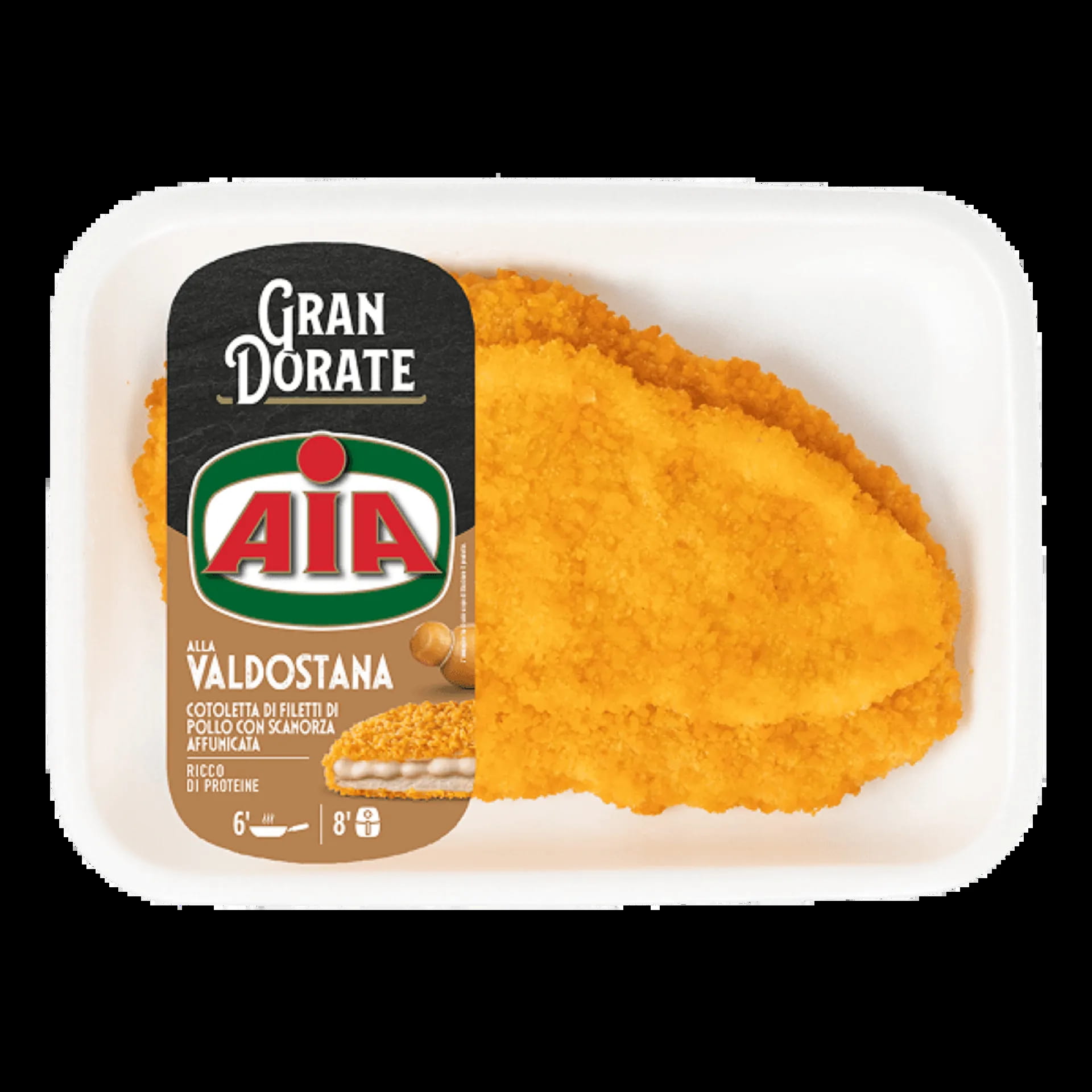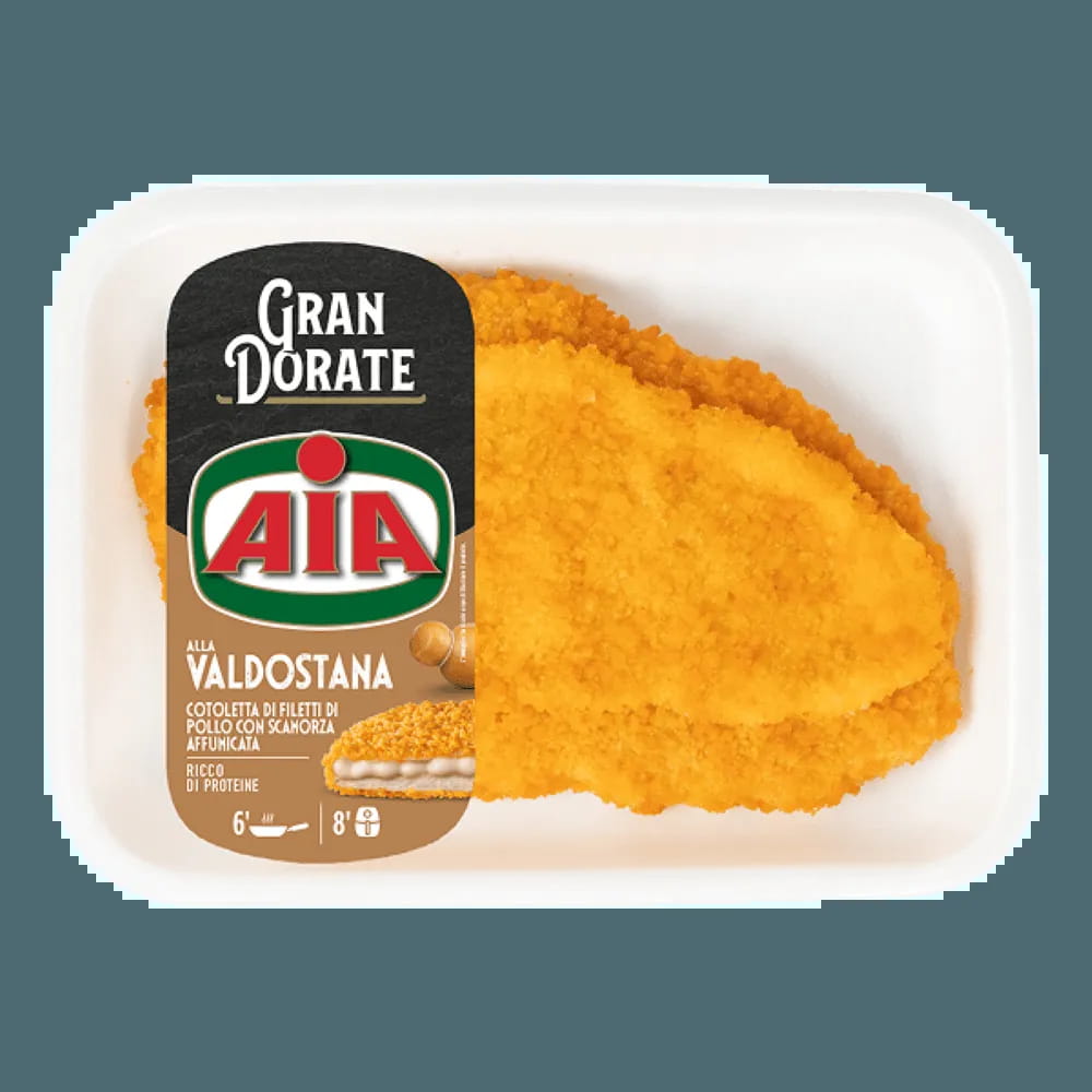Gustosa cotoletta di filetti di petto di pollo AIA arricchita da un'appetitosa farcitura al formaggio scamorza affumicata.