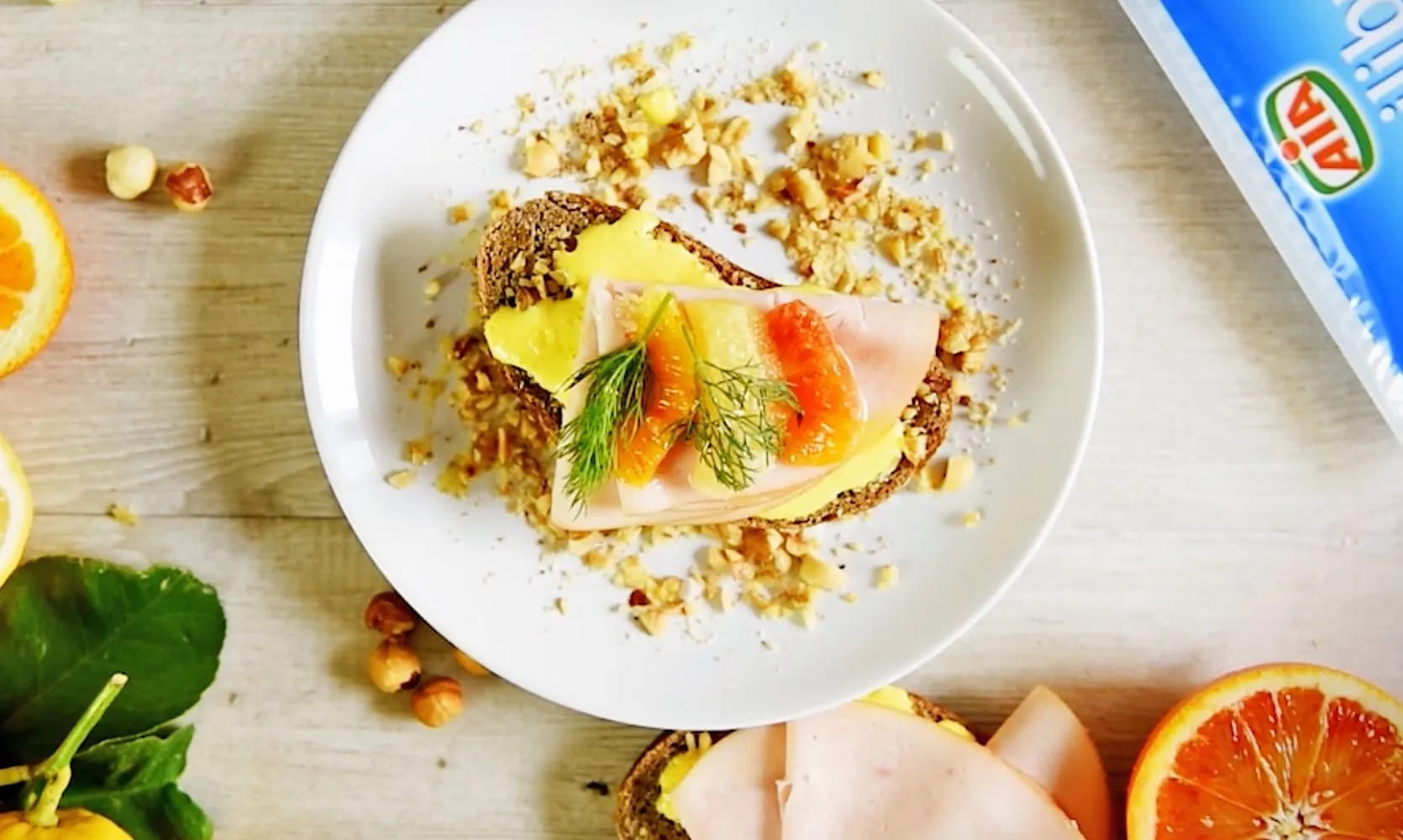 Pelate a vivo il limone e l’arancia non trattati e ricavatene degli spicchi interi privi dei filamenti bianchi. Posizionate sul piatto il pane di segale, coprite con la salsa di yogurt allo zafferano. Posizionate la fetta di petto di tacchino e guarnite con gli spicchi di agrumi, sale in fiocchi, un filo d’olio a crudo, finocchietto e aneto.