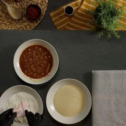 È il momento della panatura delle ali. In un piatto mescoliamo il pan grattato con un po' di paprika (dolce o affumicata, a seconda del vostro gusto), e in un altro piatto mettiamo della farina. Passiamo ogni ala di pollo prima nella farina, poi nella marinatura e infine nel pangrattato. Disponiamo le alette impanate su una teglia foderata con carta forno.