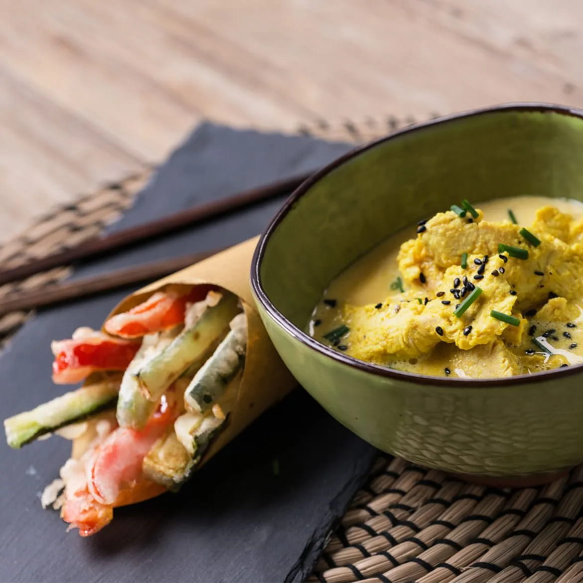Si tratta di una ricetta davvero squisita e originale che potrete divertirvi a preparare per una serata a tema, un cocktail party con gli amici o una cena in terrazzo (o in giardino) in compagnia. In questa ricetta, i bocconcini di fesa di tacchino AIA vengono marinati nel latte di cocco, così da risultare ancora più teneri nella loro salsa avvolgente. La tempura di verdure, invece, è croccante e leggera, perfetta per accompagnare il sapore speziato della carne.