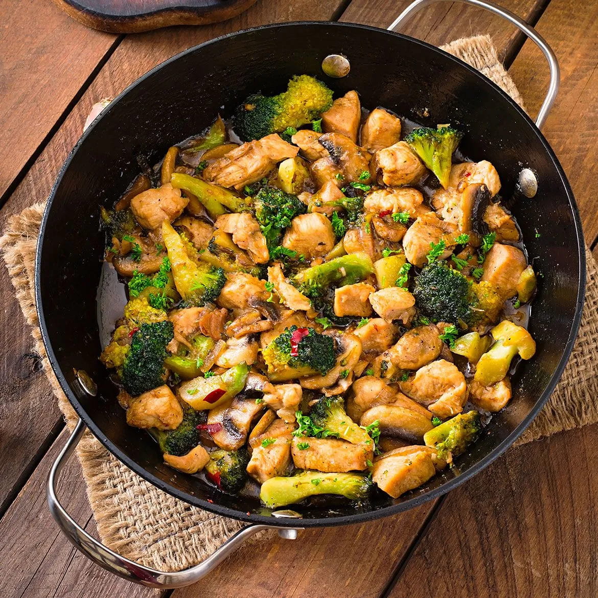 Pochi e semplici ingredienti, tanto gusto. Pollo a filetti, funghi champignon, broccoli, mandorle tostate e anacardi: un mix di sapori e consistenze davvero invitanti, per una ricetta facile e veloce da realizzare.