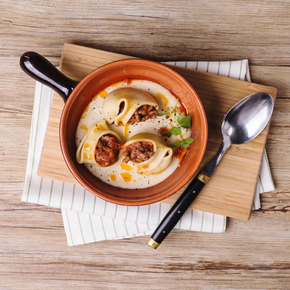 In questa preparazione un classico del pranzo della domenica come il ragù, viene arricchito dai funghi, ingrediente tipico del mese di settembre. La presentazione del ragù è insolita poiché non lo troviamo nelle classiche lasagne e neppure nei cannelloni, bensì viene usato per farcire conchiglioni gratinati che renderanno il piatto raffinato e davvero appetitoso.