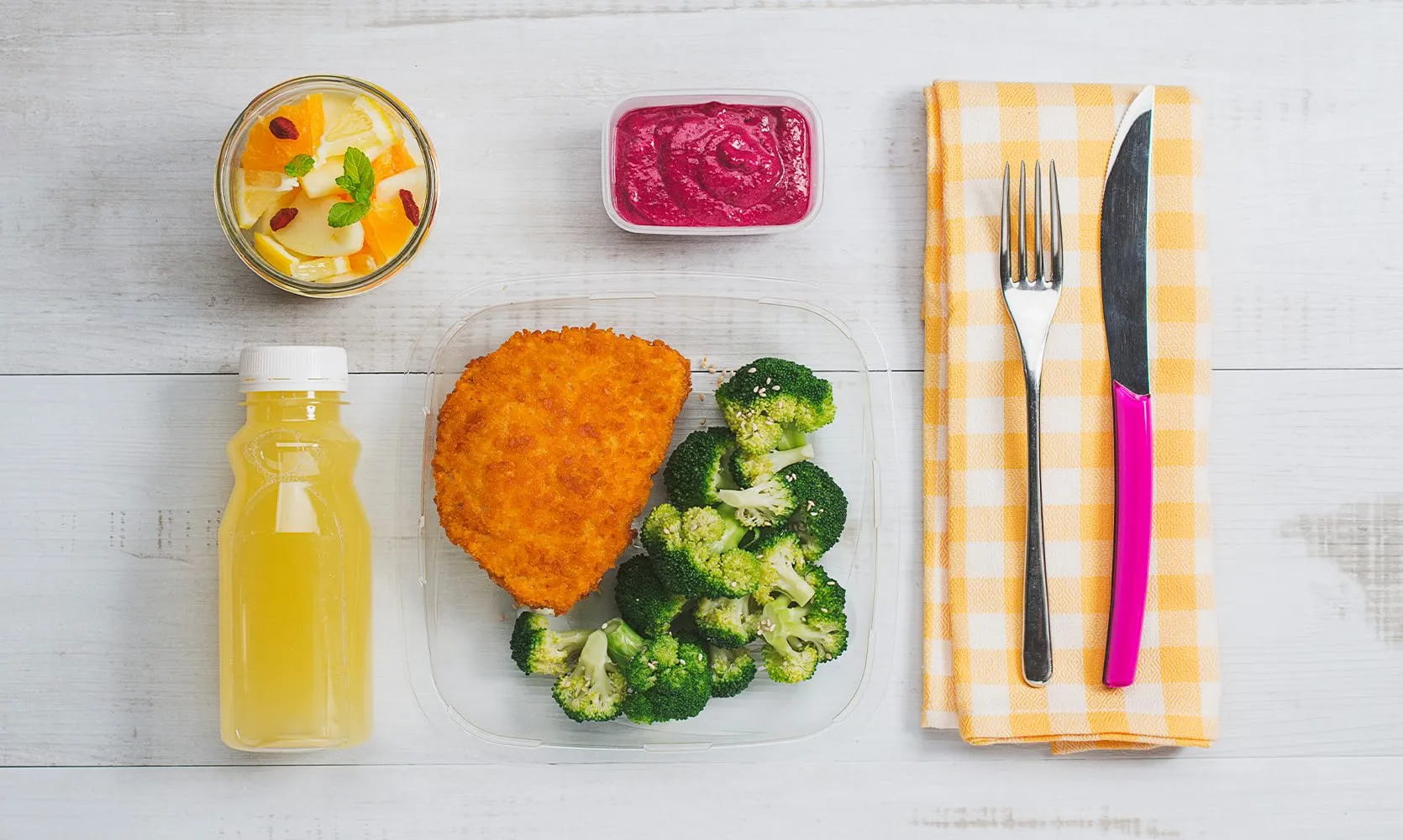 Perfetta per una pausa pranzo in ufficio colorata e ricca di gusto, ecco la ricetta completa del Cordon Bleu con salsa alla barbabietola, broccoli all’aceto di riso e sesamo, macedonia di agrumi e mele, succo d’ananas!
