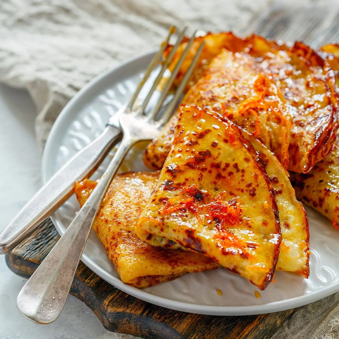 In una padella fate sciogliere a fiamma bassa un cucchiaio di zucchero e il liquore, la scorza di un limone e la scorza di un’arancia, unite poi l’impasto di zucchero e burro e portate a bollore. Una volta ottenuta una salsa, mettete nella padella le crepes e fatele bagnare bene, piegatele poi in quattro.