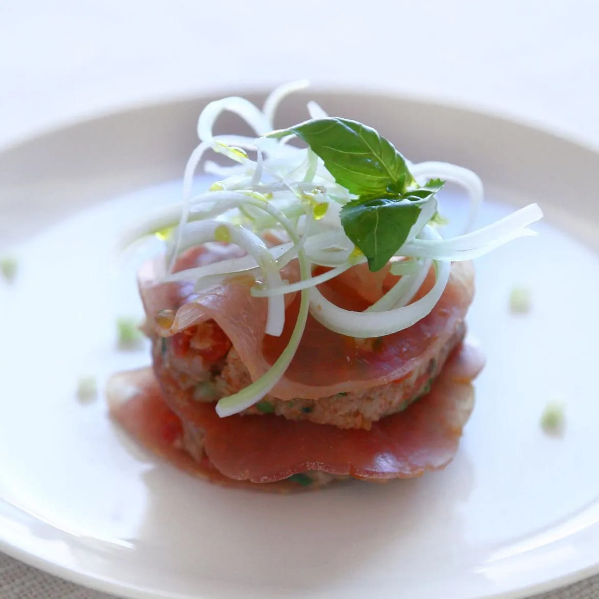 Con l’aiuto di un coppapasta, sistemate una fettina di bresaola di tacchino sul fondo, quindi un po’ di panzanella e ancora la bresaola.