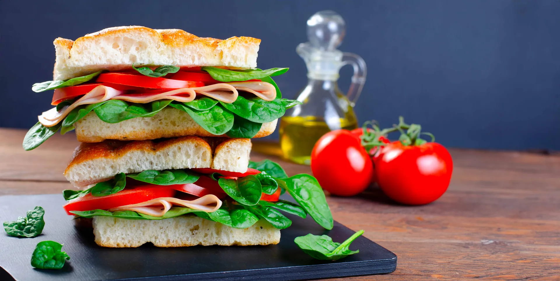 Tagliate a metà la focaccia e farcitela con le fette di petto di tacchino al forno aeQuilibrium di AIA, lo spinacino fresco, i pomodori precedentemente tagliati a fette.