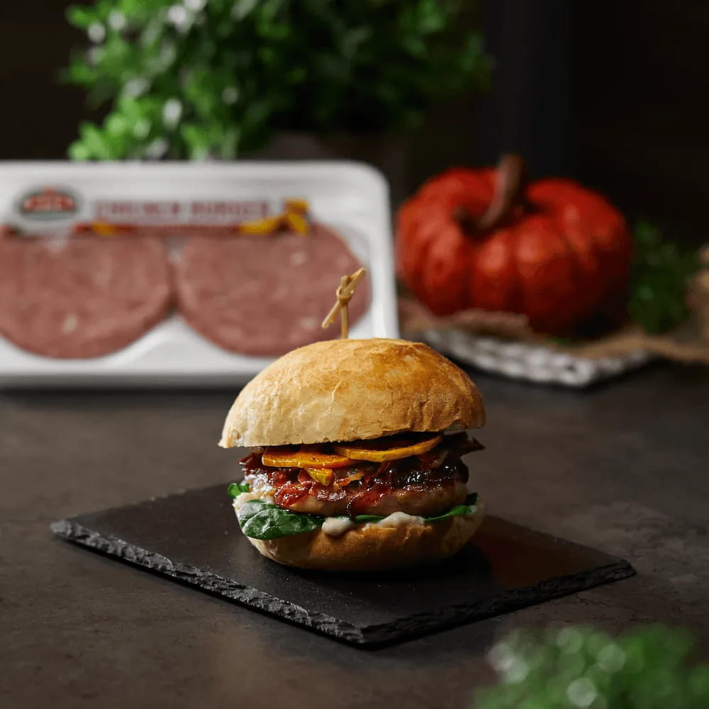 Taglia il pane e inizia a comporre il burger: posiziona su una metà l’hamburger e adagiavi sopra il formaggio affinché questo fonda. Completa con la zucca cotta a fettine, lo spinacino, la cipolla caramellata, bacon croccante e la maionese al pepe.