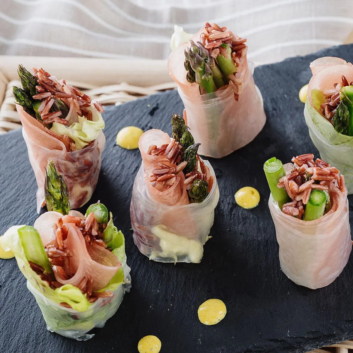 Se amate le ricette con contaminazione asiatica come ramen, pollo al limone e riso alla cantonese, questi involtini alla bresaola di tacchino e riso rosso vi conquisteranno.