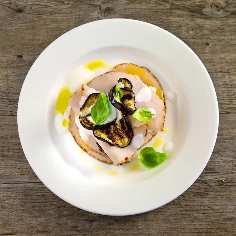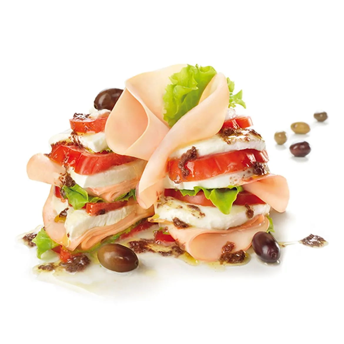 Componete gli strati con una fetta di pomodoro, mozzarella e tacchino aeQuilibrium, alternandoli con foglie di insalatina fresca.