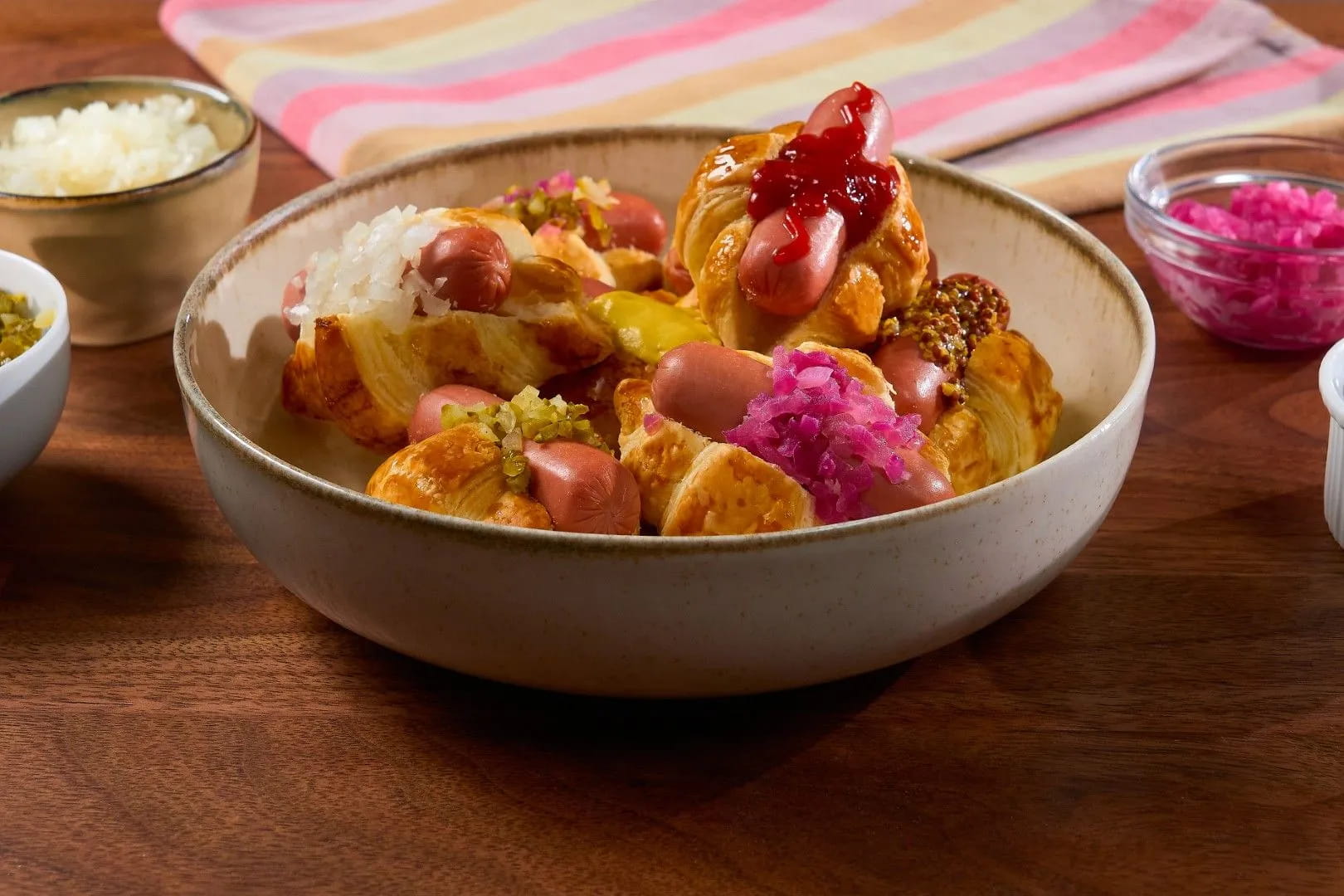 Un'idea creativa e irresistibile per l'aperitivo o un brunch. I Mini Croissant Hot Dog combinano la friabilità della pasta sfoglia alla golosità dei Wudy Snack Classico, completati da un topping a base di cetriolini, senape e cipolla rossa. Croccanti fuori e morbidi dentro, sono perfetti da servire in ciotole colorate o su taglieri da condividere. Lasciati conquistare dal formato mignon dal grande effetto.