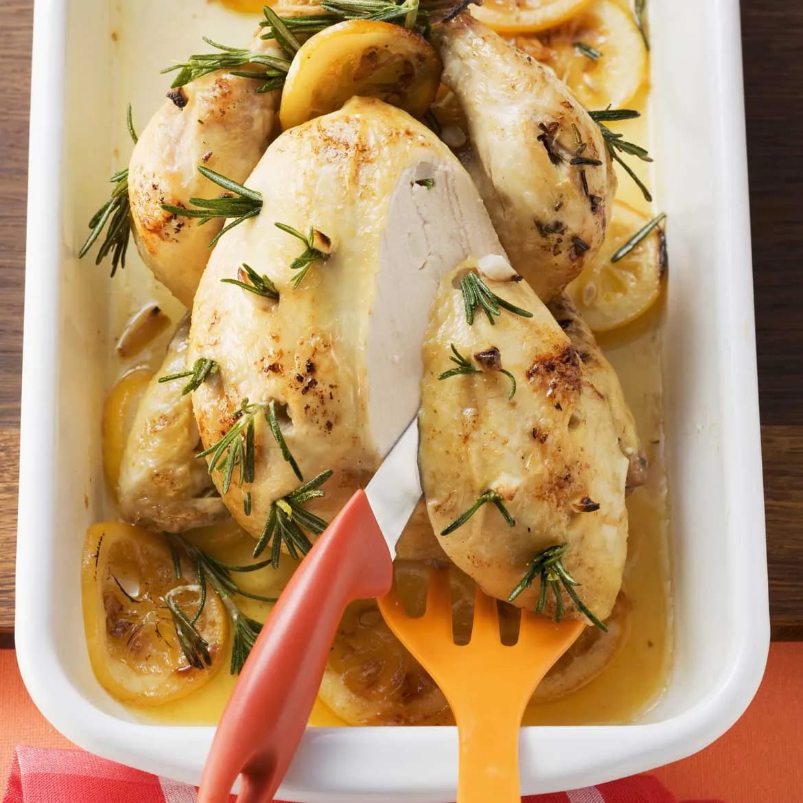 L'altro limone andrà spremuto. Versate il succo sul pollo e sistemate i cubetti di limone e le olive attorno alla carne nella pirofila. Aggiungete anche qualche rametto di rosmarino. Alzate il forno a 200°C e lasciate cuocere altri 25 minuti.