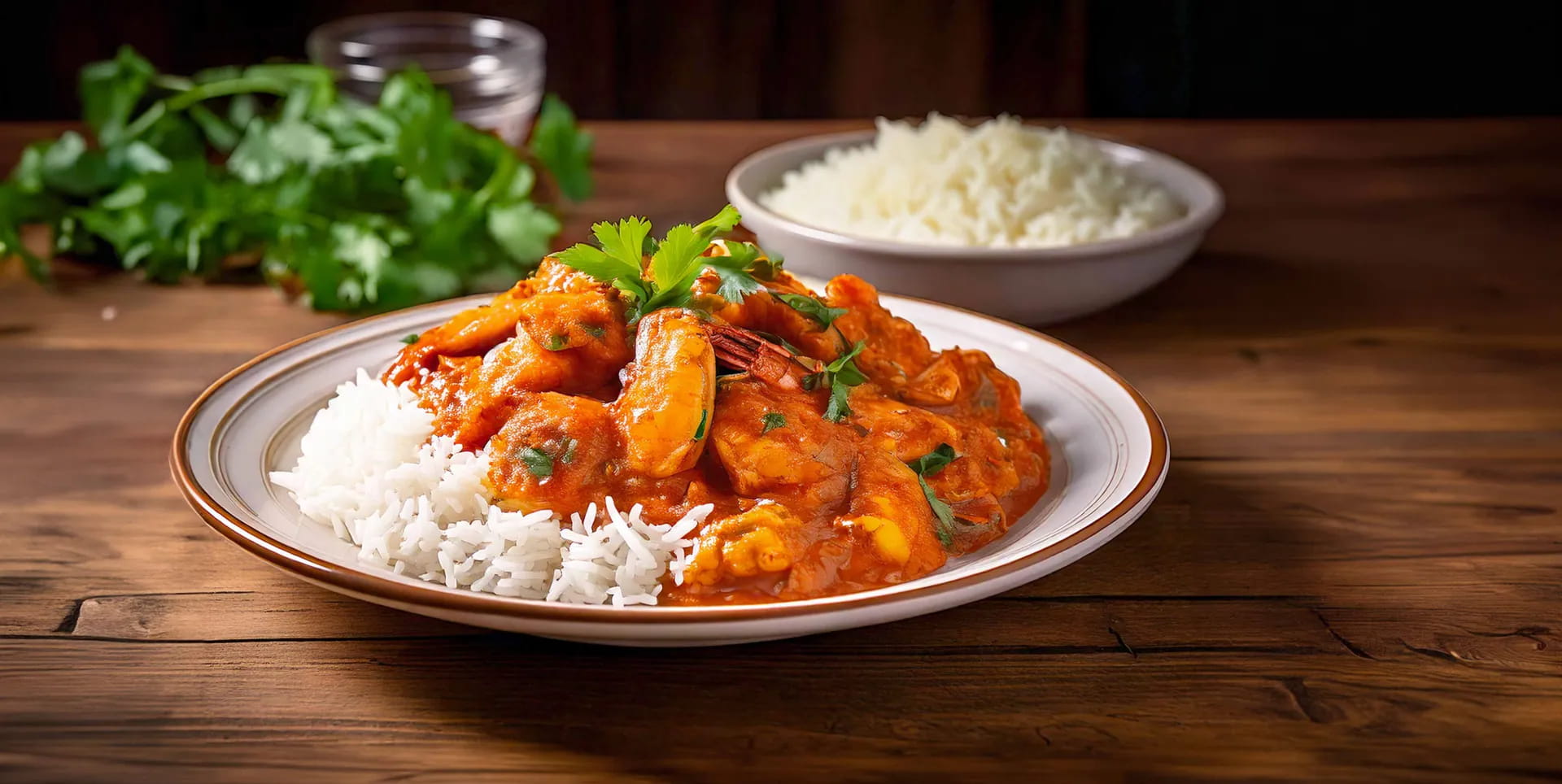 Servite il pollo e gamberi al curry accompagnandolo con il riso basmati.