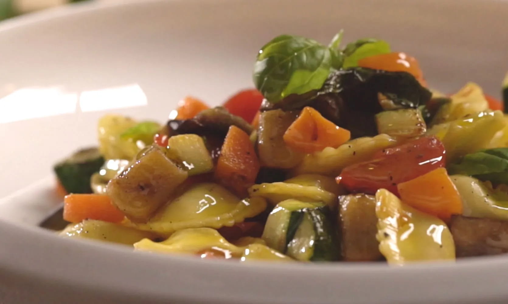 Lavate le verdure e tagliatele a cubetti. In un’ampia padella soffriggete lo spicchio d’aglio in olio extravergine di oliva. Unite le verdure e saltatele. Regolate di sale e di pepe. Lessate i raviolini in abbondante acqua bollente salata, scolateli una volta cotti e tuffateli nel condimento di verdure.