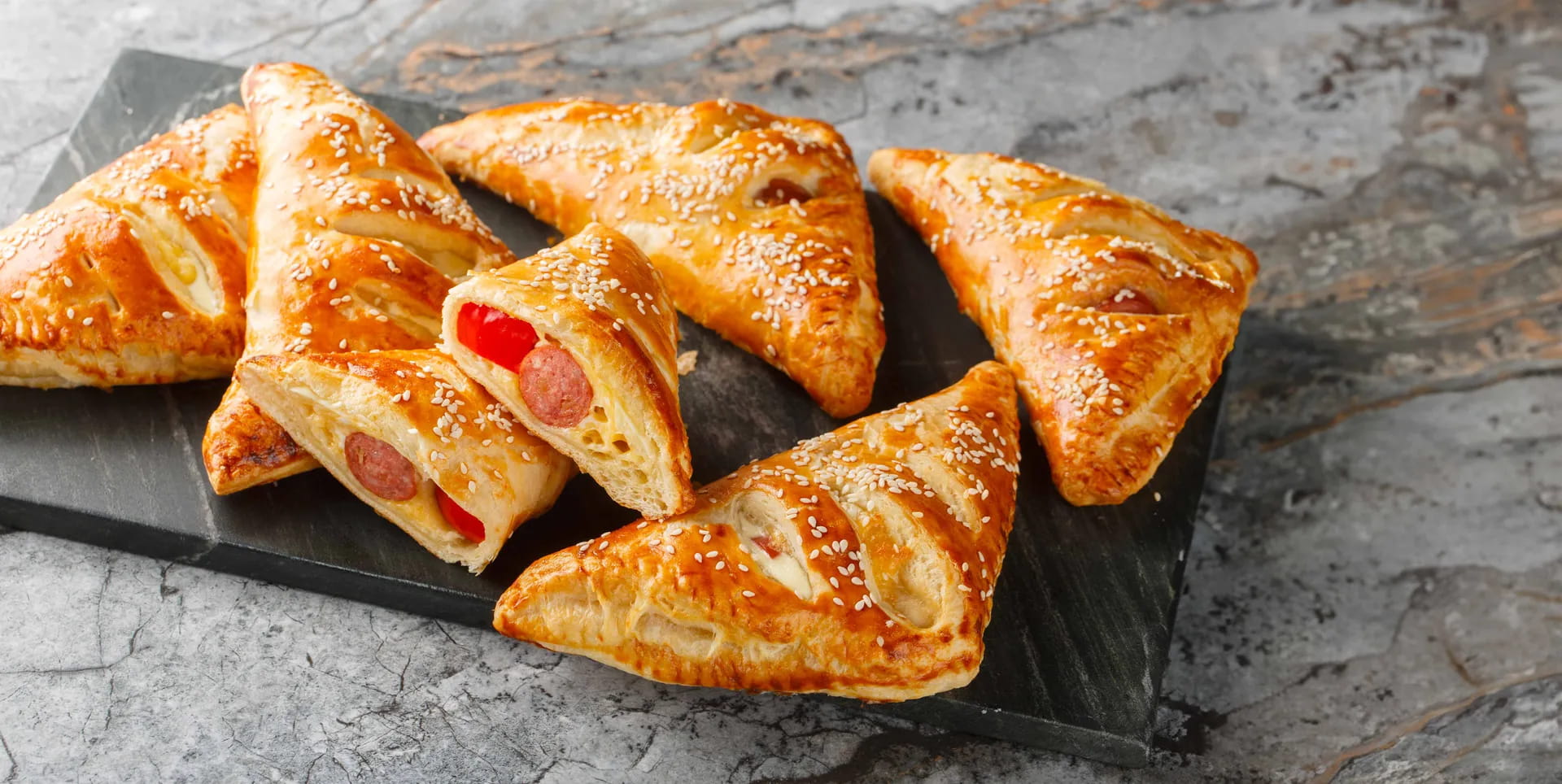 Su metà di ogni rettangolo di pasta sfoglia adagiate una fetta di emmental, un cucchiaio di peperoni e metà würstel lasciando liberi i bordi. Richiudete con l'altra metà, sigillate bene i bordi e fate dei tagli lunghi circa 1-2 centimetri sulla superficie.
