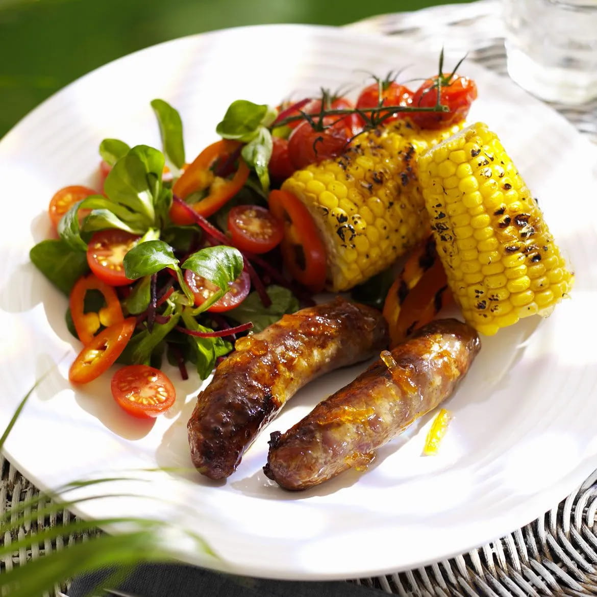 Per velocizzare la cottura vi consigliamo di usare le pannocchie precotte che sono già pulite e pronte per essere messe sul fuoco. Sistemate le pannocchie e le salsicce sulla brace e fatele cuocere.