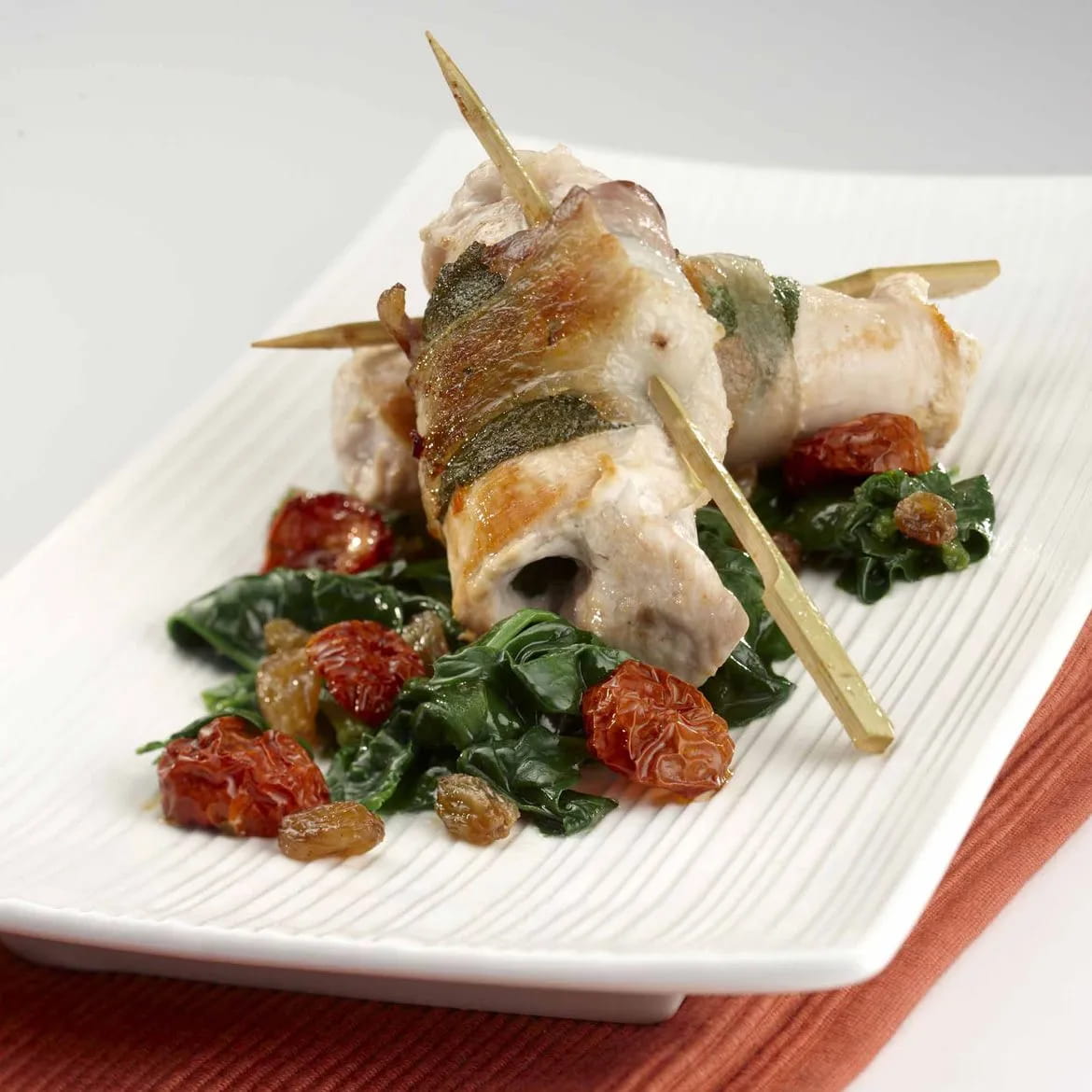 Servite i saltimbocca posizionandoli sul letto di bietoline e decorandoli con i pomodorini canditi.