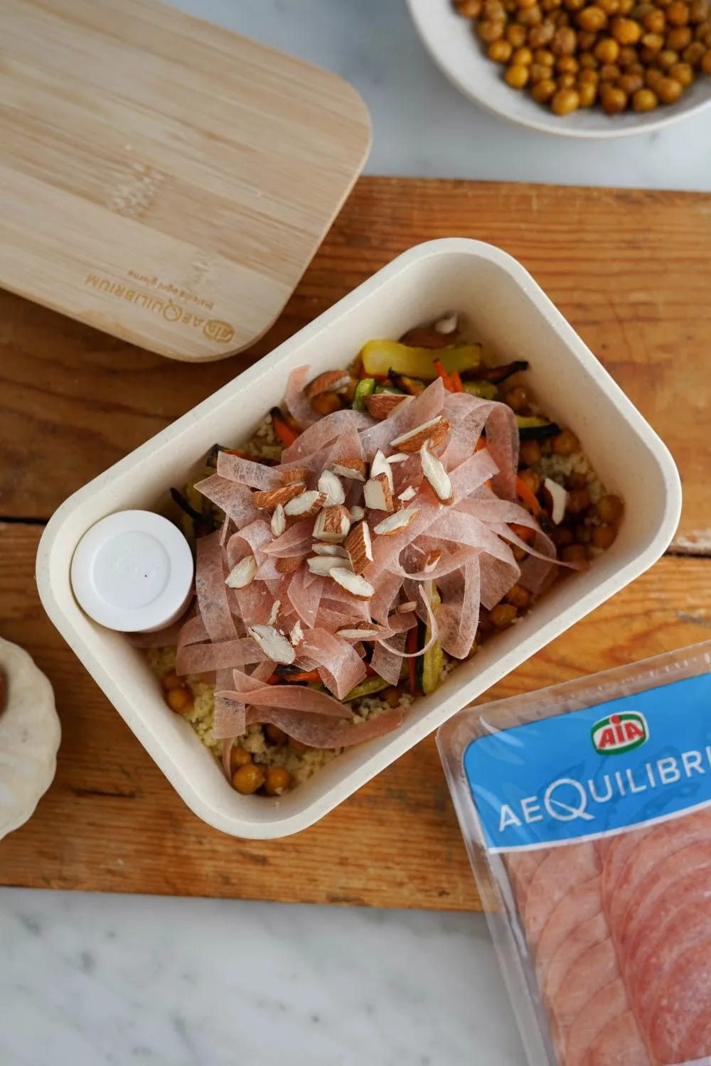 I pranzi veloci e noiosi in ufficio? Anche basta. Prova questa schiscetta per una pausa pranzo colorata e bilanciata: cous cous, verdure, ceci croccanti e bresaola di tacchino AeQuilibrium si incontrano in un mix di sapori mediterranei e texture irresistibili. Il tocco finale? Una citronette fresca e leggera che esalta ogni sapore. Perfetta per chi vuole mangiare bene anche fuori casa, senza rinunciare al piacere.