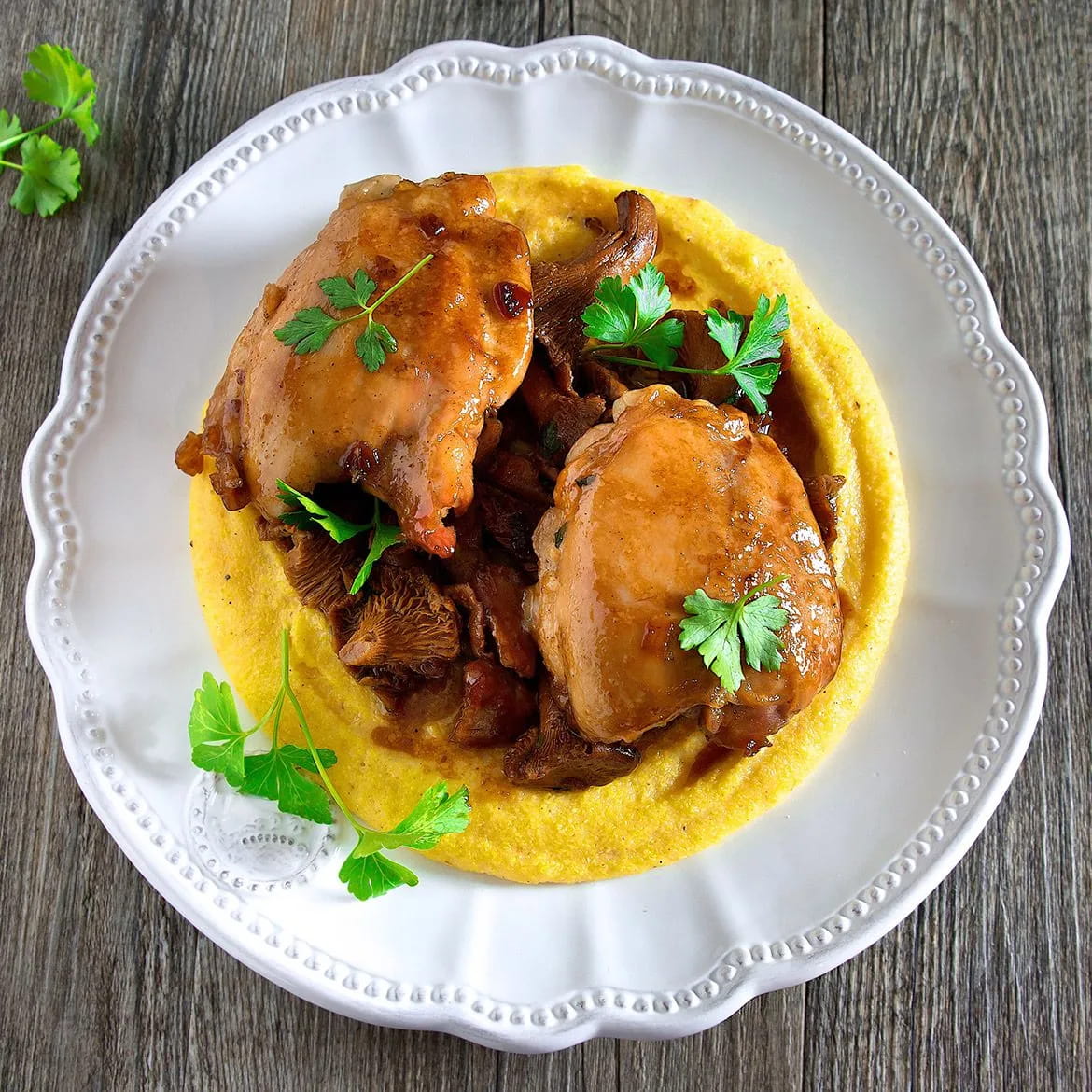 Ecco la ricetta completa delle sovracosce di pollo al miele con polenta al curry e funghi.