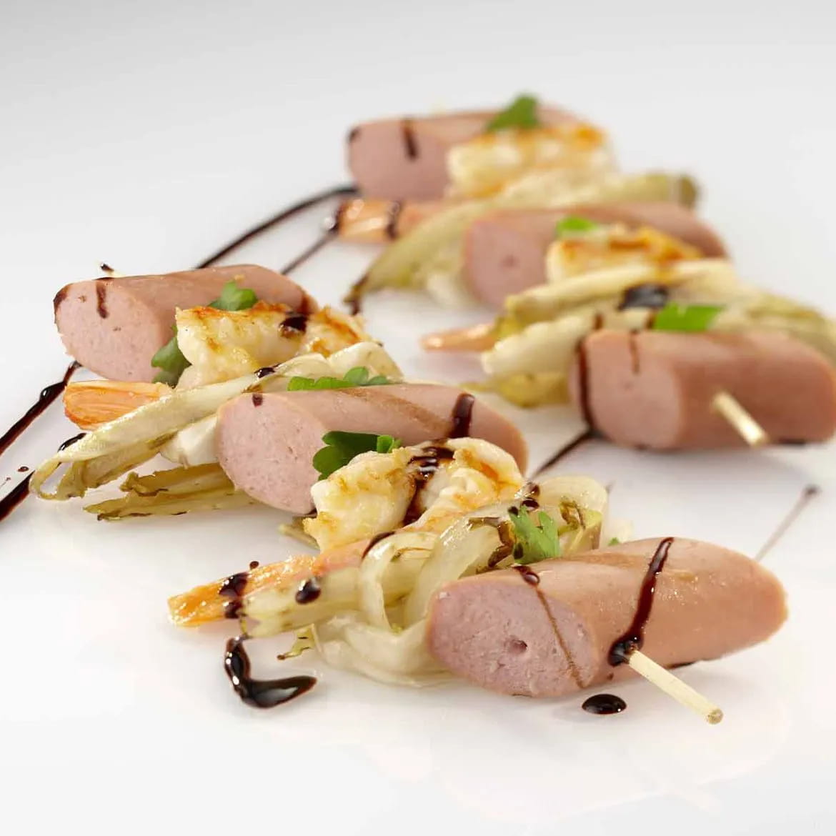 Spruzzate qualche goccia di aceto sui würstel e condite l’indivia e i gamberi con un’emulsione di olio, aceto, sale e pepe. Cuocete i wurstel in padella per 4 minuti. Quindi infilate negli stecchini nell’ordine: würstel, indivia e gambero. Fate cuocere su una griglia ben calda girandoli per farli abbrustolire su tutti i lati.