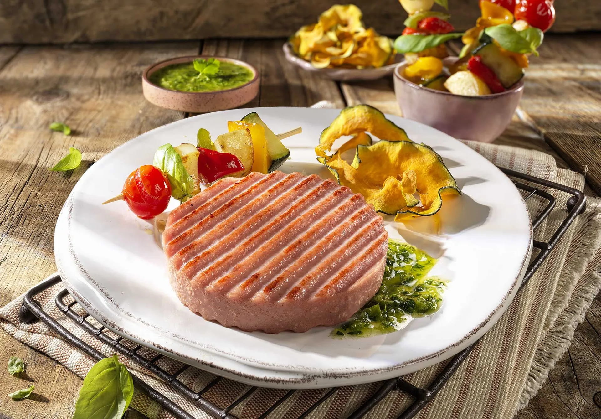 I Wudy Burger con prosciutto cotto diventano il cuore di un piatto gustoso e delicato. Accompagnati da chips di zucca croccanti e spiedini di verdure saporite, questi Burger sapranno conquistare grandi e piccini con una proposta del tutto originale. Scopri come comporre il piatto passo dopo passo!