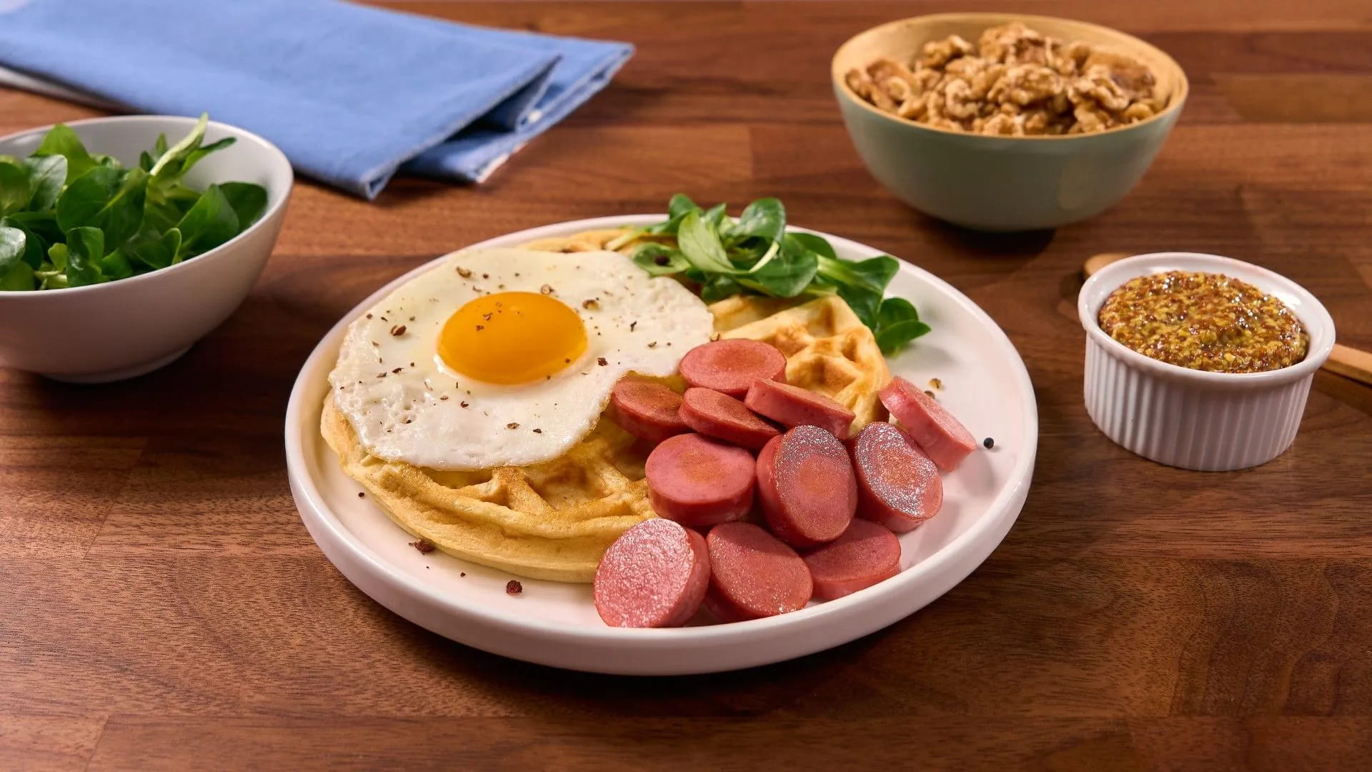 Un piatto che strizza l’occhio al brunch all’americana. I Wudy classici si uniscono alla sofficità dei waffle salati arricchiti con formaggio e aneto, mentre l’uovo all’occhio di bue con tuorlo morbido aggiunge cremosità e colore. Perfetti per una colazione salata abbondante, un pranzo easy o un piatto unico da servire in stile bistrot.